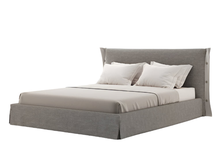 Elevate your bedroom with this elegant upholstered bed featuring a modern yet timeless design. The bed is fully upholstered in a soft, textured grey fabric that brings warmth and sophistication to any interior. Its tall headboard is accented with subtle wingback sides and decorative button details, adding a touch of classic charm. The low-profile base is seamlessly tailored with corner pleats for a clean and structured look. Paired with neutral bedding, this bed offers a cozy and inviting aesthetic—perfect for contemporary or transitional bedroom styles. Crafted with durability and comfort in mind, it’s a beautiful centerpiece for restful nights.
