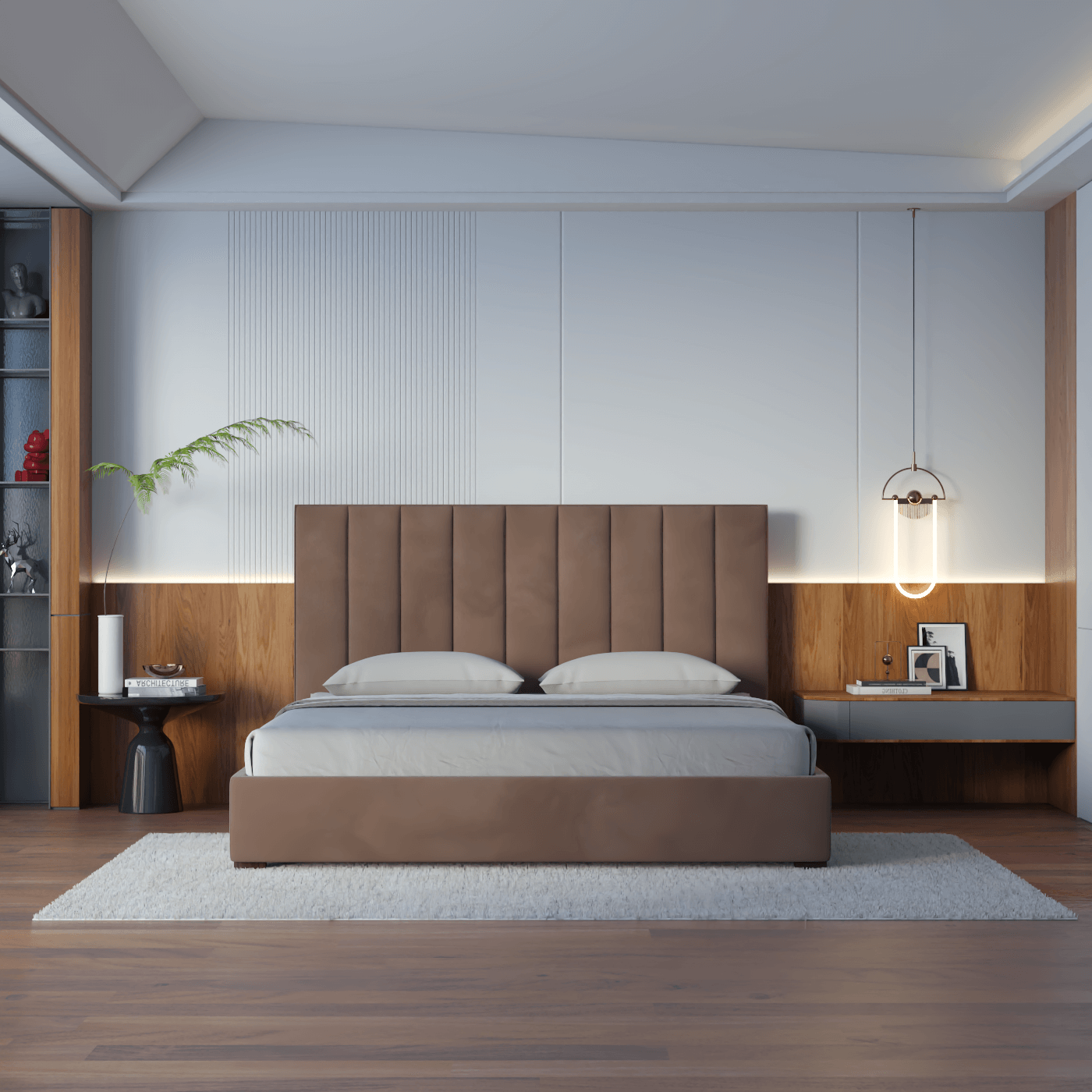 Das Ava-Bett mit hohem Kopfteil verleiht jedem Schlafzimmer mit seinem hohen, vertikalen Kopfteil einen modernen, kühnen Look. Das schlanke Design und der weiche Stoff verleihen ihm ein stilvolles und dennoch gemütliches Gefühl. Dieses Bett ist auf Langlebigkeit ausgelegt und perfekt für alle, die einen Hauch von Eleganz hinzufügen und gleichzeitig die Dinge einfach und bequem halten möchten. Eine großartige Wahl für ein herausragendes Schlafzimmermöbel.
