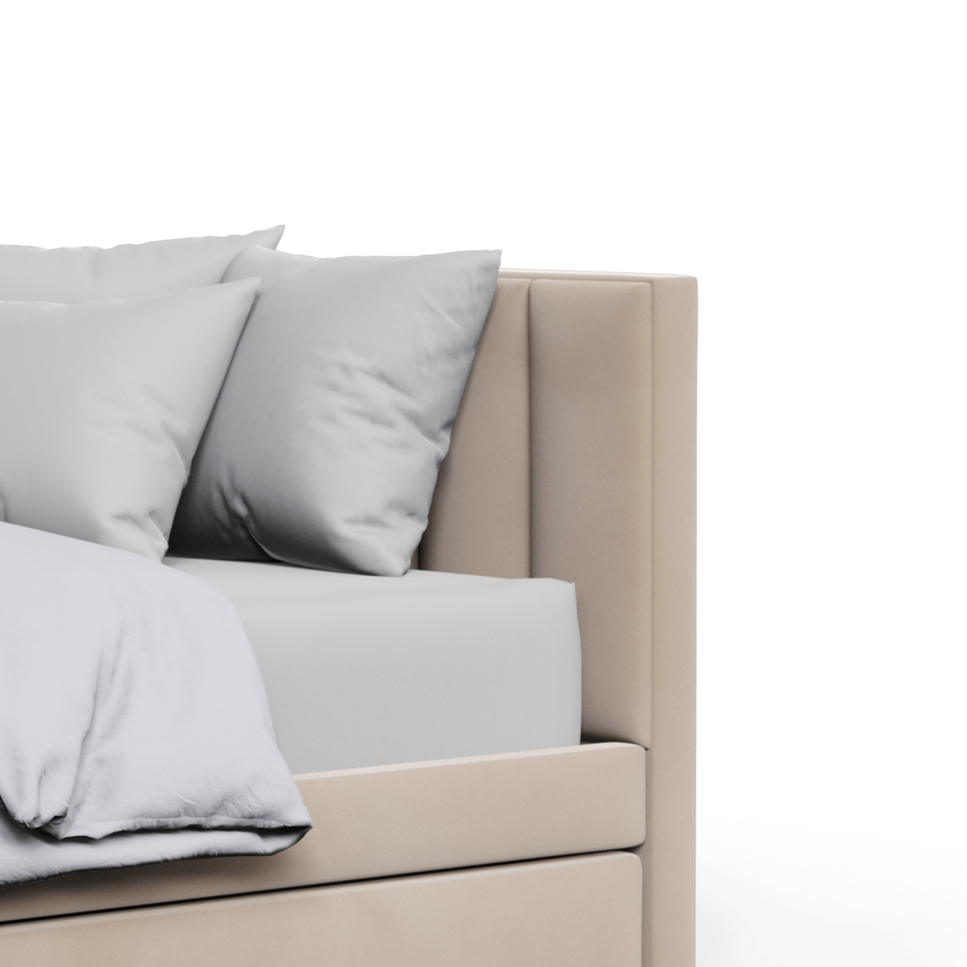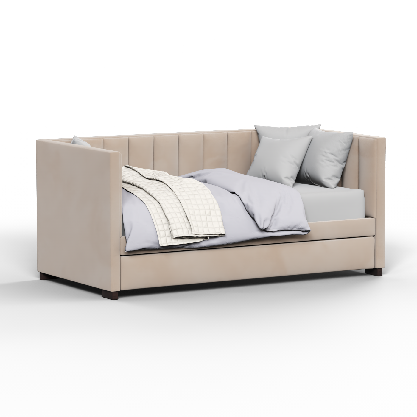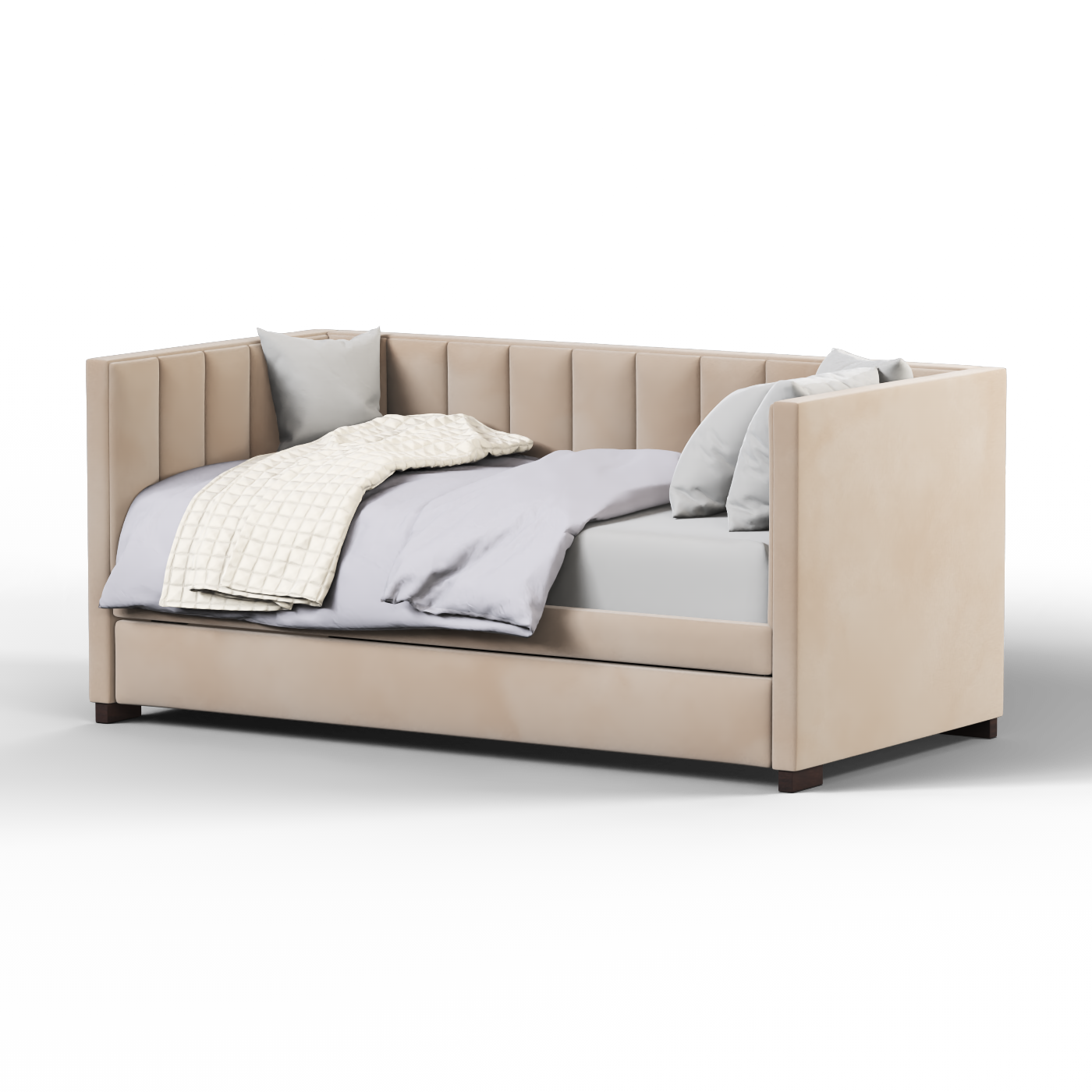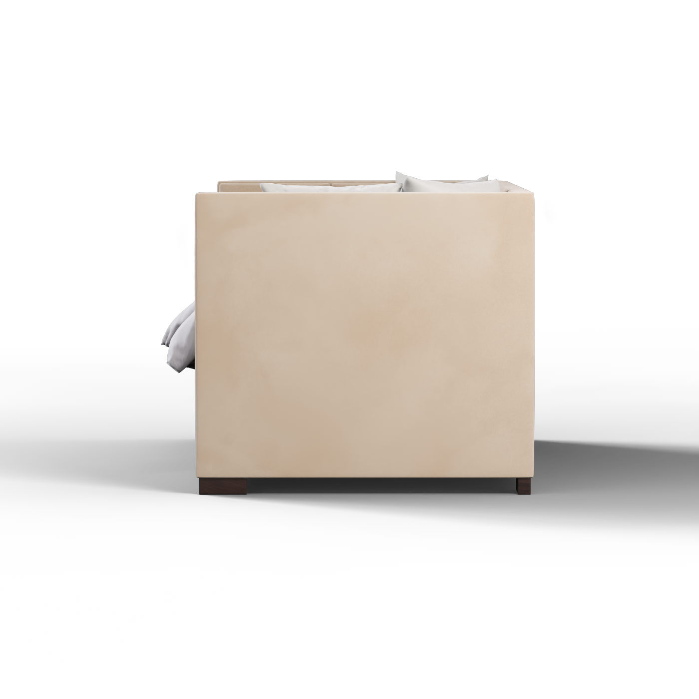 Das Capella Daybed verbindet modernes Design mit praktischer Vielseitigkeit. Seine hohe, gepolsterte Rückenlehne und Seitenteile sind mit dezenten vertikalen Steppnähten versehen und schaffen so einen gemütlichen Platz zum Sitzen oder Schlafen. Die weiche Polsterung sorgt für Komfort, während der robuste Rahmen eine lange Nutzungsdauer gewährleistet. Es ist ideal für kleine Räume oder Mehrzweckräume und eignet sich auch hervorragend als Kinderbett, da es Stil und Funktionalität in einem kompakten Stück vereint.