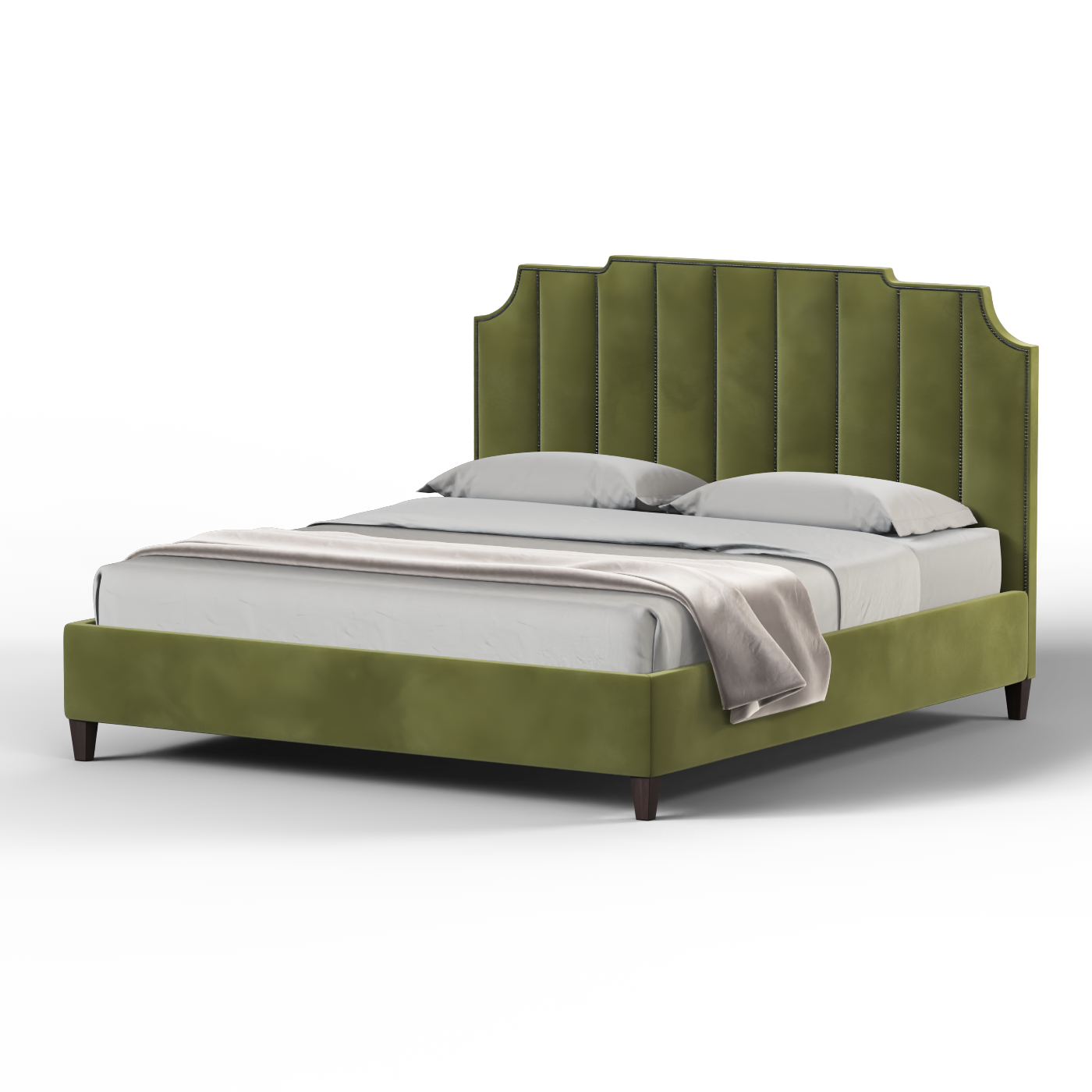Das Bett Gabriella bringt mit seinem markanten, detailreichen Kopfteil und den klaren, vertikalen Linien klassische Eleganz in Ihr Schlafzimmer. Die einzigartige Silhouette verleiht eine raffinierte Note, während die weiche Polsterung für ein gemütliches und einladendes Gefühl sorgt. Dieses Bett wird von stabilen Beinen getragen und bietet sowohl Stil als auch Haltbarkeit.