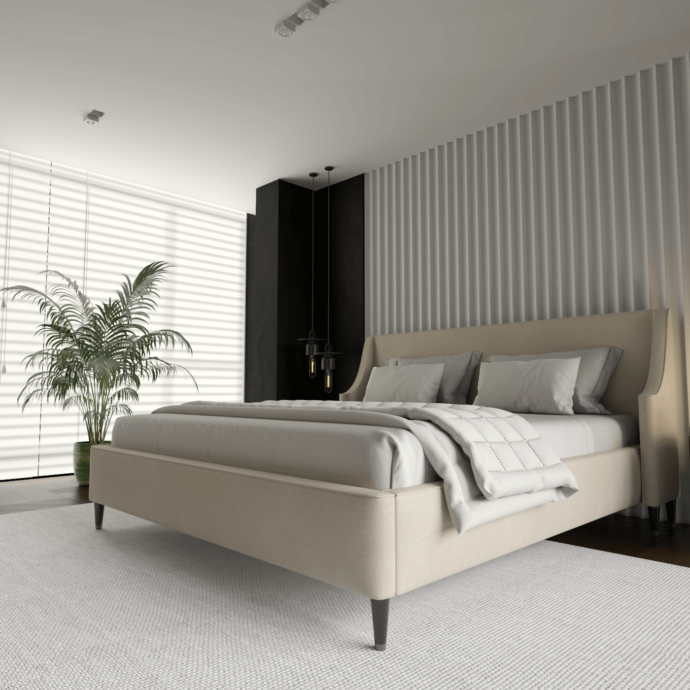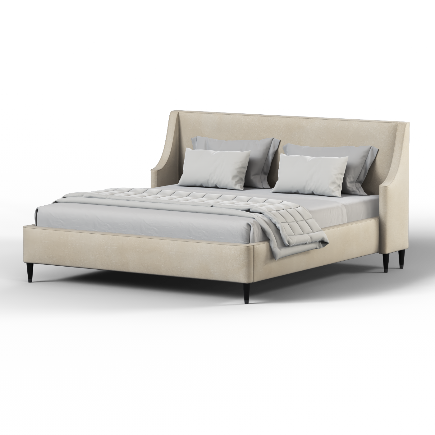 Das Bett Laura bietet mit seinem anmutig geschwungenen Kopfteil und den glatten Seitenteilen eine Balance aus Stil und Komfort. Mit seiner weichen Polsterung verleiht es jedem Schlafzimmer eine gemütliche, edle Note. Die konischen Beine des Bettes mit metallischen Akzenten unterstreichen sein modernes Design und sorgen für einen eleganten und dennoch dezenten Look. Laura ist die perfekte Mischung aus Luxus und Funktionalität für ein anspruchsvolles Schlafzimmer. Auf Bestellung handgefertigt und in 6-8 Wochen für 49 £ geliefert