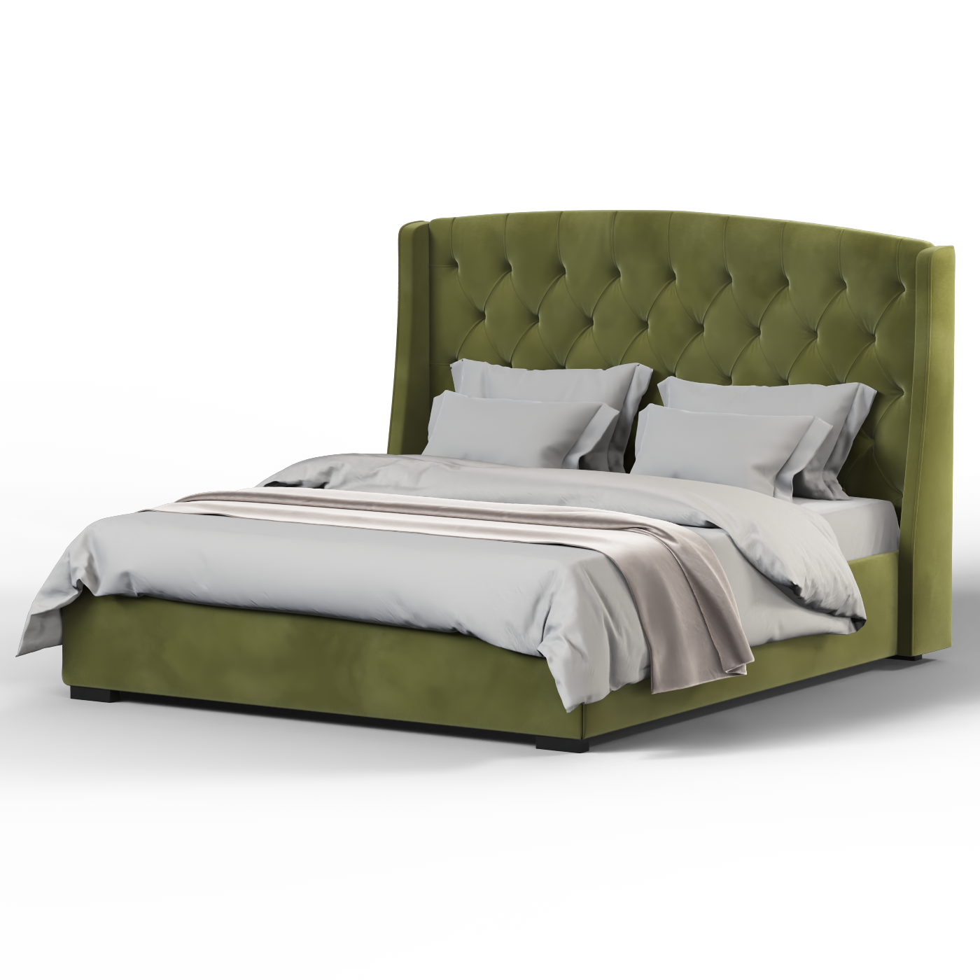 Das Sophia Buttons Headboard Bed verfügt über ein hohes, getuftetes Kopfteil mit klassischer Knopfleiste und abgerundeten Kanten. Sein weicher, gepolsterter Rahmen bietet sowohl Komfort als auch ein zeitloses Aussehen. Das Bett steht auf einem stabilen Unterbau, der Haltbarkeit gewährleistet und gleichzeitig eine anspruchsvolle Ästhetik bewahrt. Das Design verbindet klassische Eleganz mit modernem Komfort und macht es zu einem Blickfang in jedem Schlafzimmer.