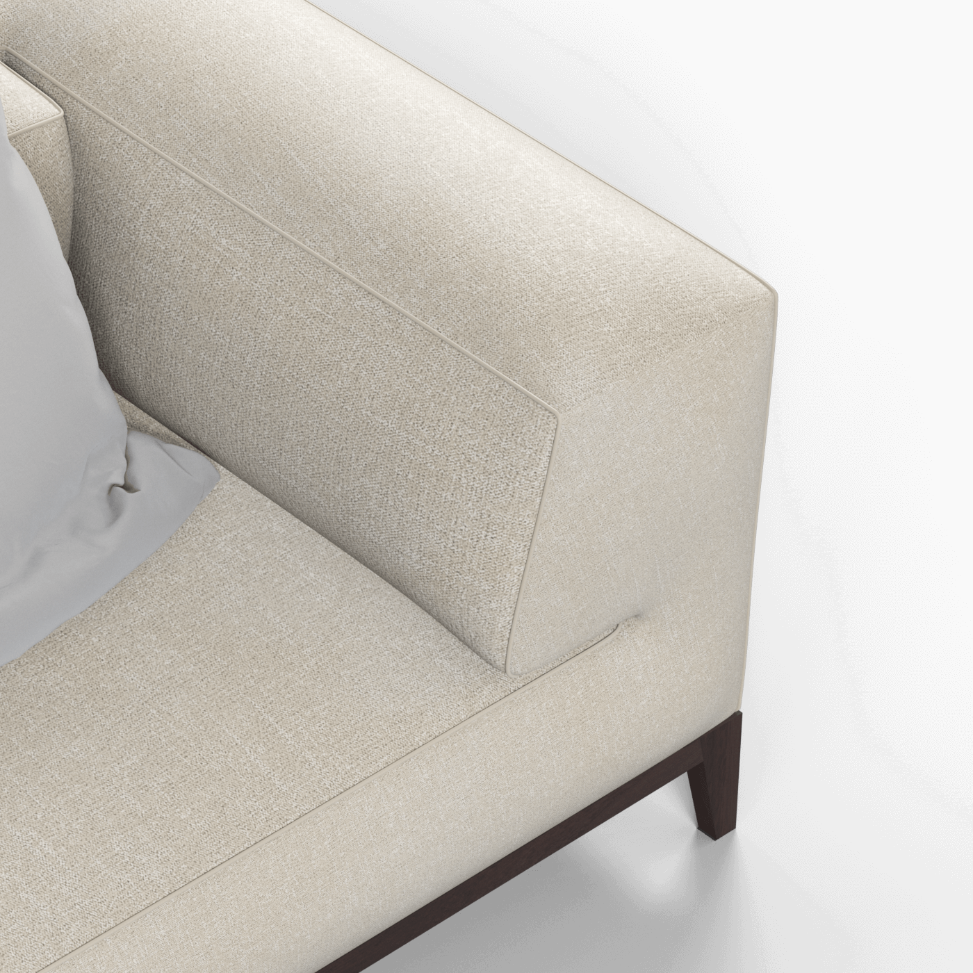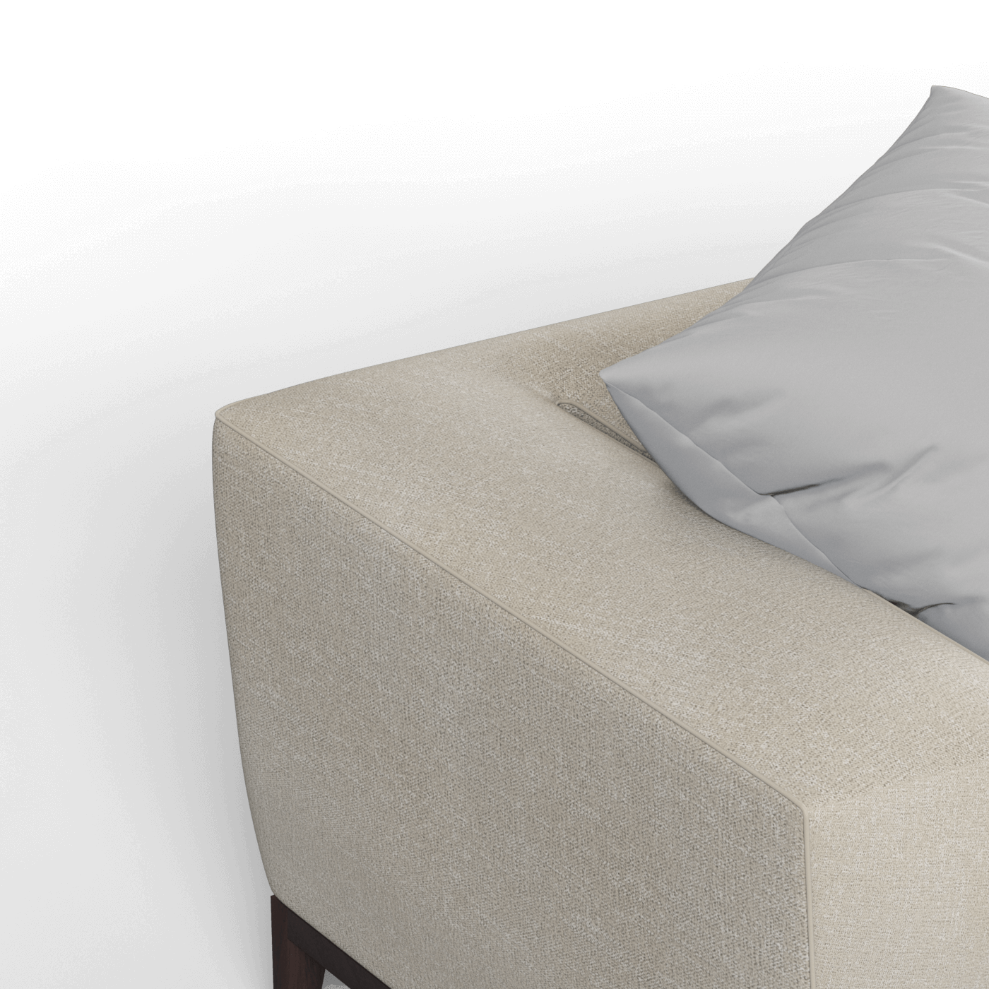 Das Strand Sofa zeichnet sich durch ein schlankes, minimalistisches Design mit klaren Linien und einem flachen Rahmen aus. Seine breiten Armlehnen und die tiefe Sitzfläche schaffen eine bequeme Liegefläche, während die robuste Konstruktion für lange Haltbarkeit sorgt. Das Sofa steht auf eleganten, konischen Beinen, die ihm einen modernen Touch verleihen und es zu einem vielseitigen Möbelstück machen, das gut in jedes moderne Wohnzimmer passt.
